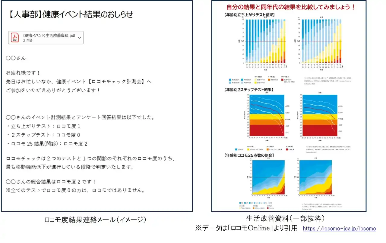 本計測会は、従業員が自身の身体状態を把握し、日常生活の中での運動・生活習慣を見直すきっかけづくりを目的としています。計測後は、参加者アンケート回答に基づき判定した「ロコモ度」と、結果に対するコメントを記載したメールを個別に送付しています。あわせて、結果の詳細説明に関するパンフレットも送付し、理解促進と行動変容につながるフォローを行っています。計測会は、大阪本社勤務者対象に、2024年11月と2025年10月に開催し、いずれも約4割の従業員が参加しました。 |