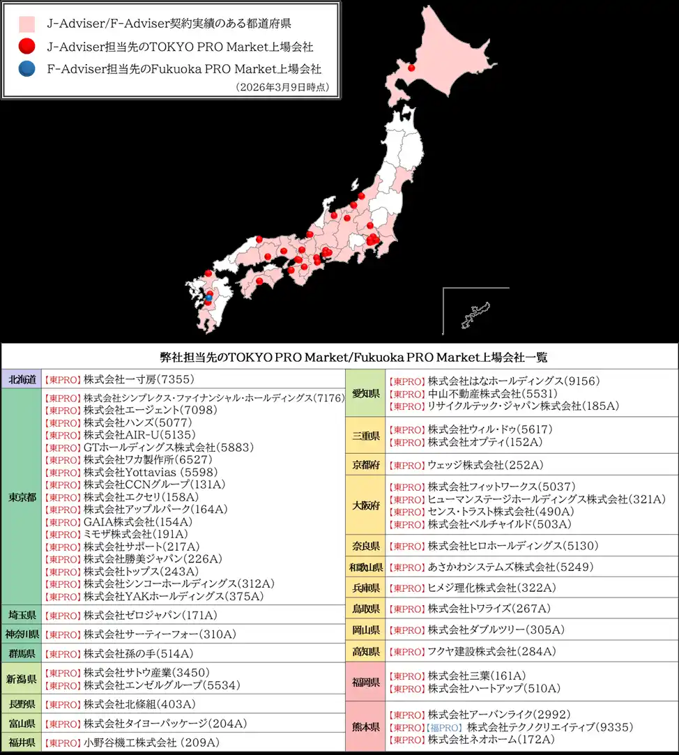 また、2024年12月には、福岡証券取引所が運営するプロ投資家向け市場、Fukuoka PRO Marketの上場指導・審査を行うF-Adviser資格も取得いたしました。 |