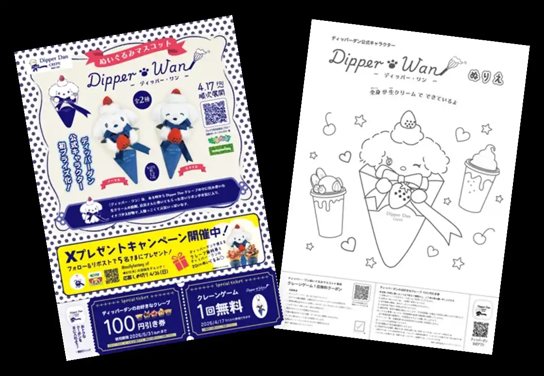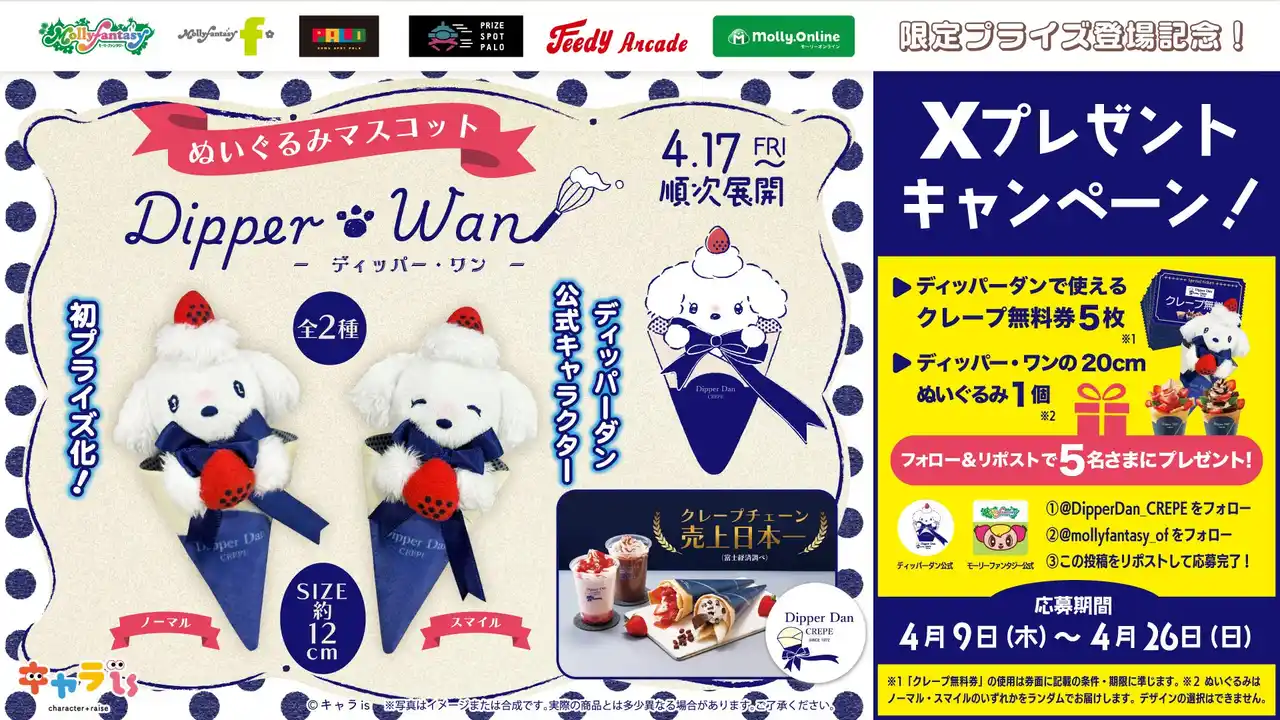 限定プライズ用景品の展開を記念し、モーリーファンタジー公式Xでは、「クレープ無料券5枚+ディッパー・ワンの20cmぬいぐるみ1体」が抽選で5名さまに当たるSNSキャンペーンを開催いたします。詳細は公式アカウントをご確認ください。 |