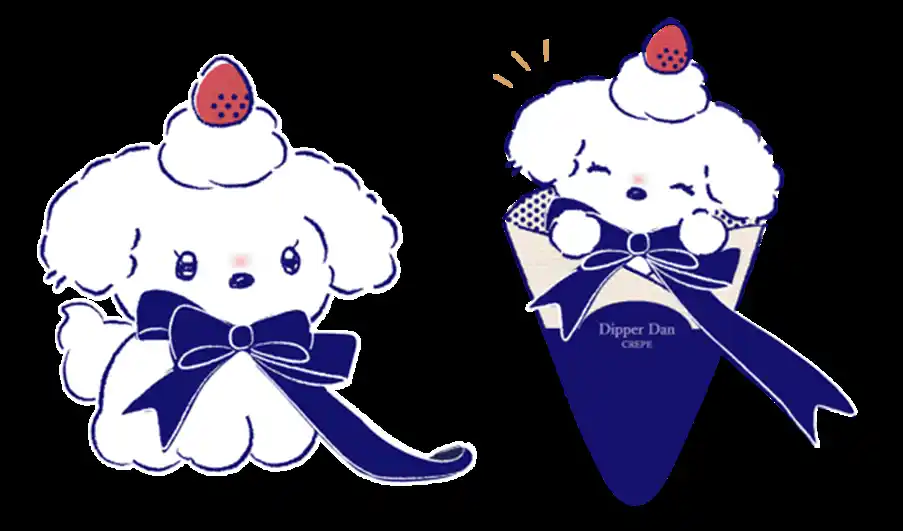 キャラis主催のコンテストから、クレープチェーンの「ディッパーダン」公式キャラクターに採用されたキャラクター。『ある時からDipper Danクレープの中に住み着いた生クリームの妖精。店員さんに巻いてもらった青いリボンがお気に入り。イチゴが大好物で、人懐っこくて元気いっぱいな子。』 |