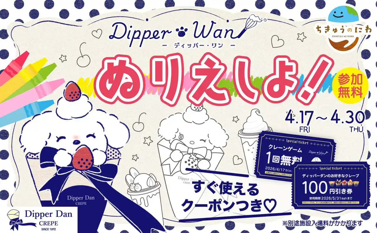 ■「クレーンゲーム1回無料クーポン」&ディッパーダンのお店で使える「クレープ割引クーポン」がついたぬりえをプレゼント!