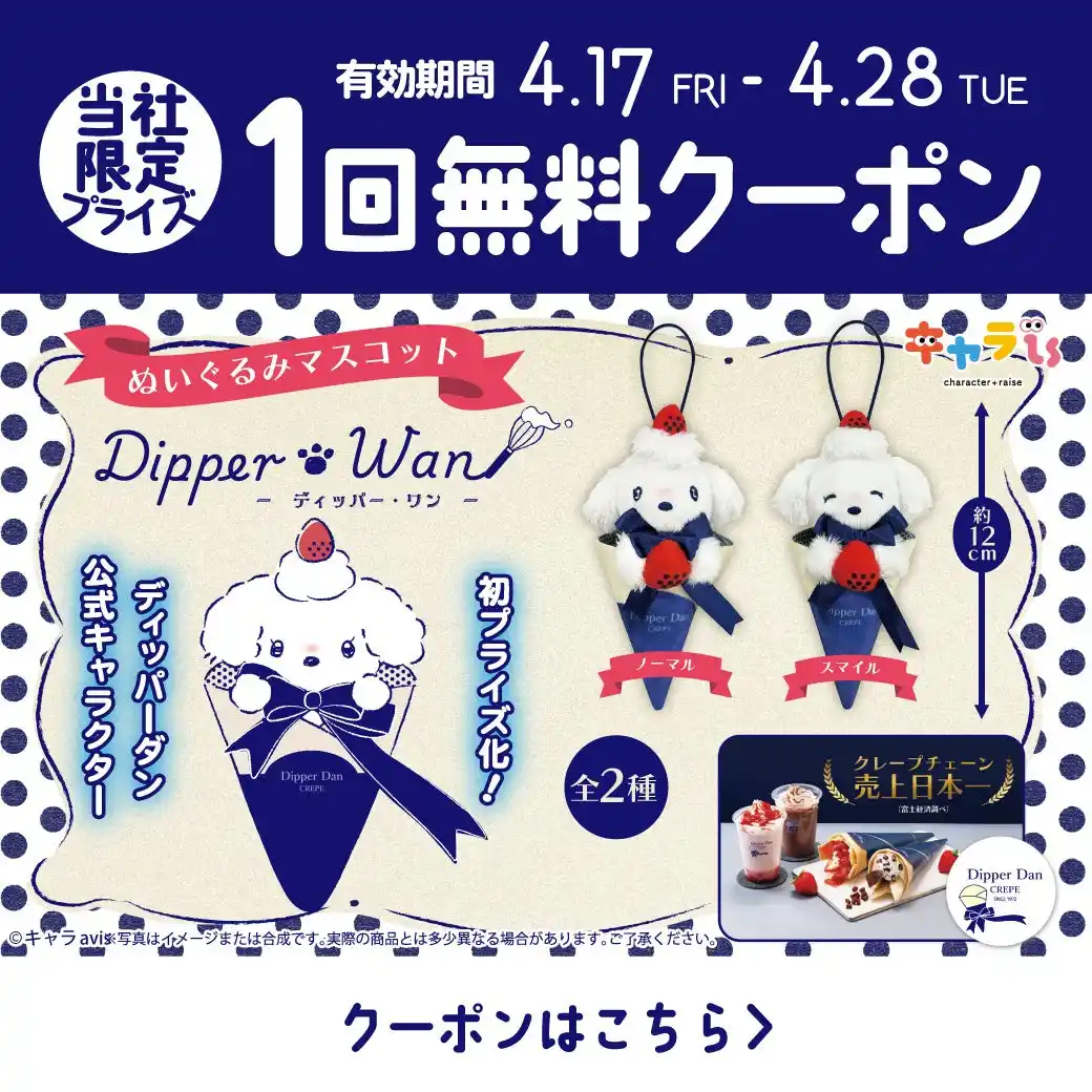 ■「クレープ無料券5枚+ディッパー・ワンの20cmぬいぐるみ1体」が当たるXキャンペーンを開催! |