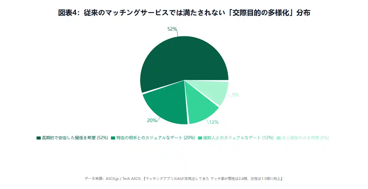 | 「ソロエコノミー(独身経済)」の進化に伴い、婚活・恋活市場のペインポイントは「出会いのチャネル不足」から「効率性を欠く」へと移行しつつある。日本の著名な婚活リサーチ機関(株式会社バチェラーデート)が発表した市場レポートによると、回答者の90%が「マッチングアプリ疲れ」を明確に経験しており、1ヶ月あたり1人平均18時間もの「ソーシャル・サンクコスト(埋没費用)」が発生している。次世代型のリアルな出会いを提供するクラブ「Yoitoki」は、AIアルゴリズムの仕組みを導入することで、汎ソーシャル領域においてスマートコントラクトに類似した経済モデルを初めて応用した。これにより、独身層が恋愛活動における消耗を効率化重視へと変換し、O2O経済に新たな活力を注入することに成功している。 | ||||||