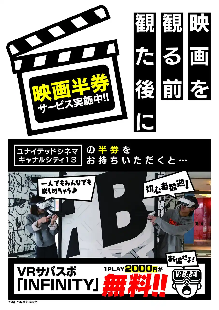 ・内容: 「VRサバスポ INFINITY」(通常1プレイ 2,000円)が1回無料 ・条件: 「ユナイテッド・シネマ」の映画半券(当日分のみ有効)を受付にてご提示ください。 ・対象アトラクション: VRサバスポ INFINITY |