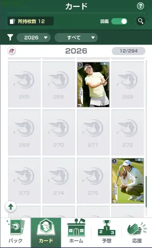 実際のトーナメントの順位を予想する「トーナメント予想」や、推し選手を応援券で応援し、ランキングの上位にすることで新カードが実装される「応援」など、女子プロゴルフをもっと好きになるコンテンツが盛りだくさん!さらに、コレクションしたカードの中から育成したい選手を選んでツアーのトップを目指すゲームモード「ヒロインズロード」も楽しめます。 |