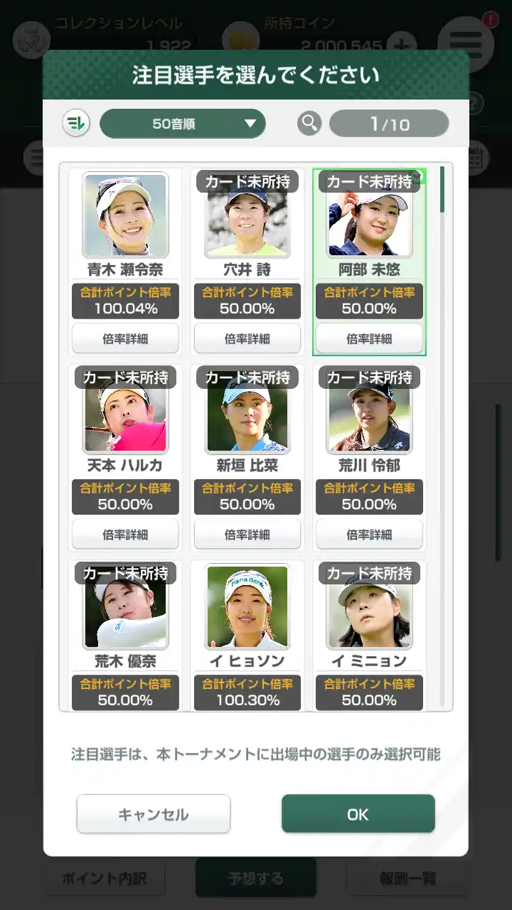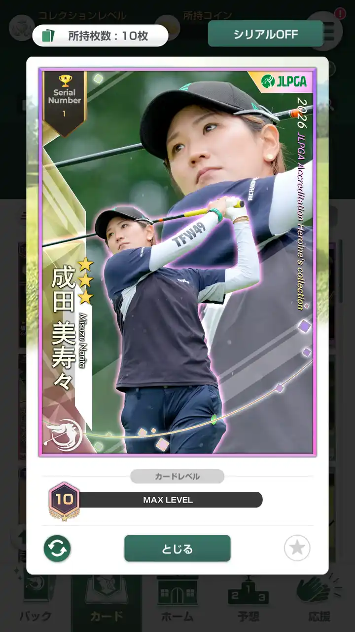 カードを集めた枚数に応じてLVが上がり、トーナメント予想などで有利になります。 |