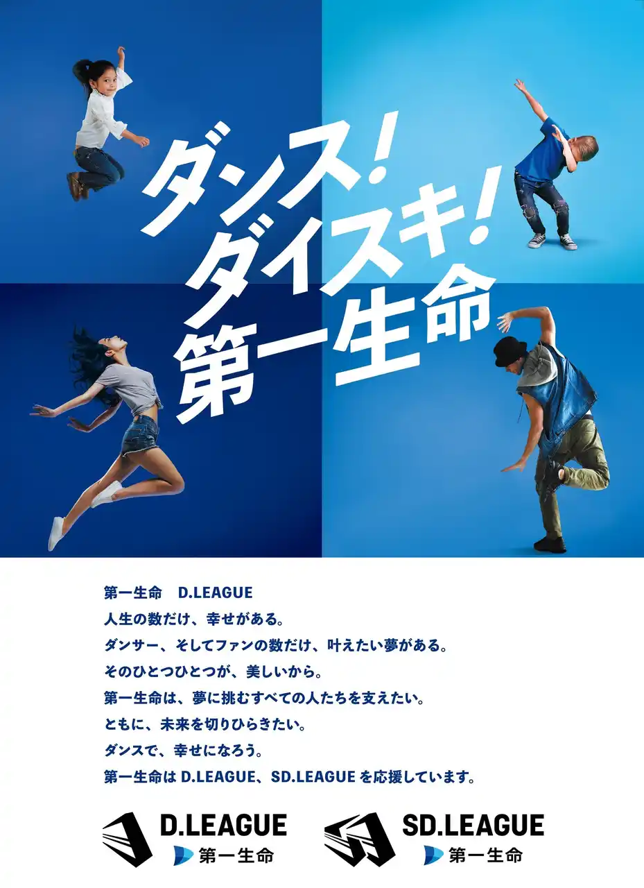 | 第一生命は、タイトルスポンサーとして、『第一生命 D.LEAGUE』を応援しています。そして『D.LEAGUE』を通じて、ダンスの魅力の発信をサポートするとともに、世界中すべての人の『ダンスのある幸せな人生』を支え続けます。 | |||