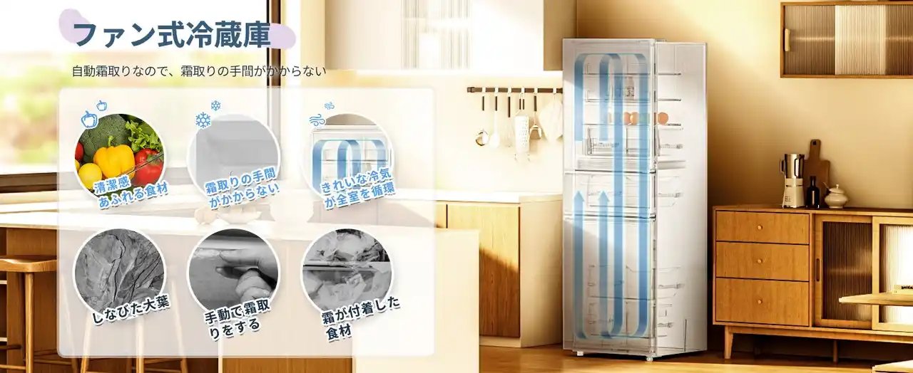 | ファン式だから霜取りは一切不要。きれいな冷気が庫内を循環し、食材に霜がつくのを防ぎます。しなびやすい大葉も鮮度長持ち。手間いらずで、清潔感あふれる保存空間をキープします。 | |||