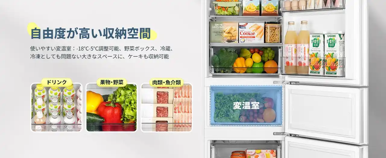 | 自由自在な収納設計!大容量&変温機能で食材たっぷり | |||