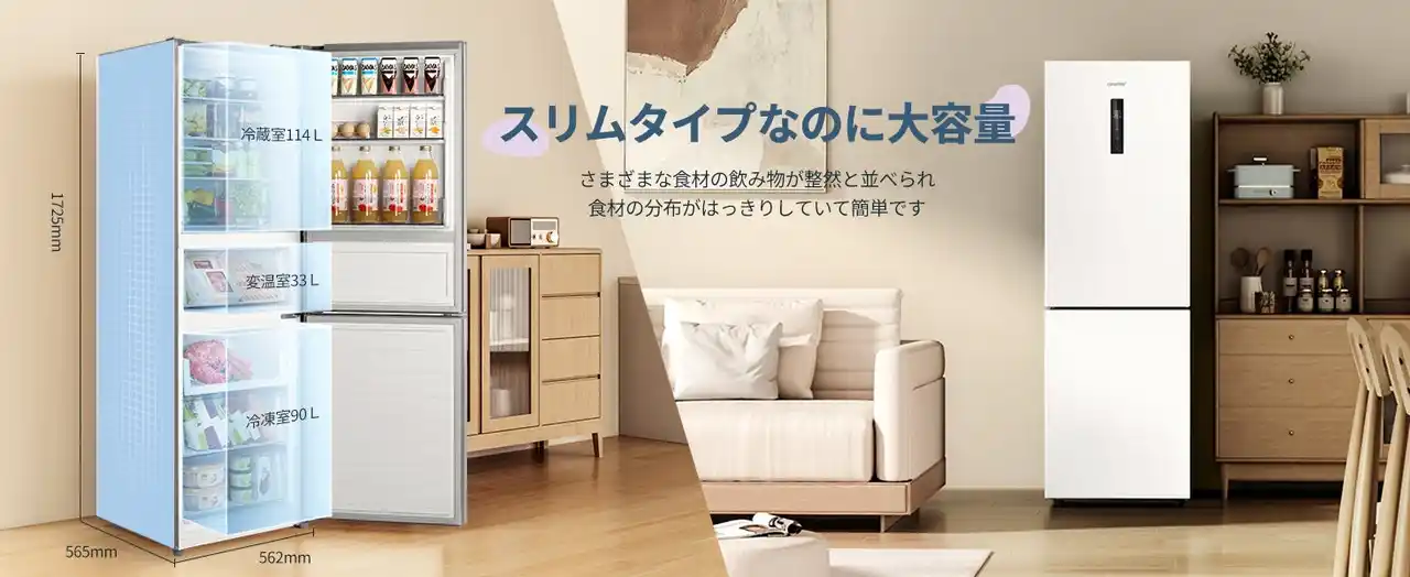 | 冷蔵室114L・変温室33L・冷凍室90Lの合計237L。食材の分類保存がしやすく、限られたスペースにも収まるスリム設計(幅562×奥行565mm)です。 | |||