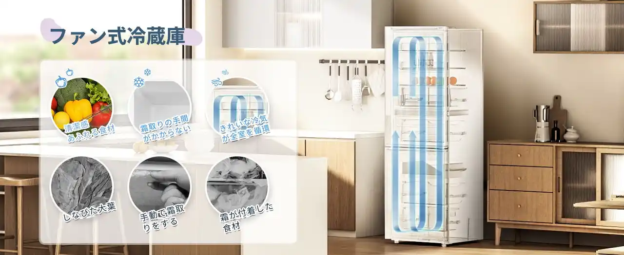 | ファン式だから霜取りは一切不要。きれいな冷気が庫内を循環し、食材に霜がつくのを防ぎます。しなびやすい大葉も鮮度長持ち。手間いらずで、清潔感あふれる保存空間をキープします。 | |||