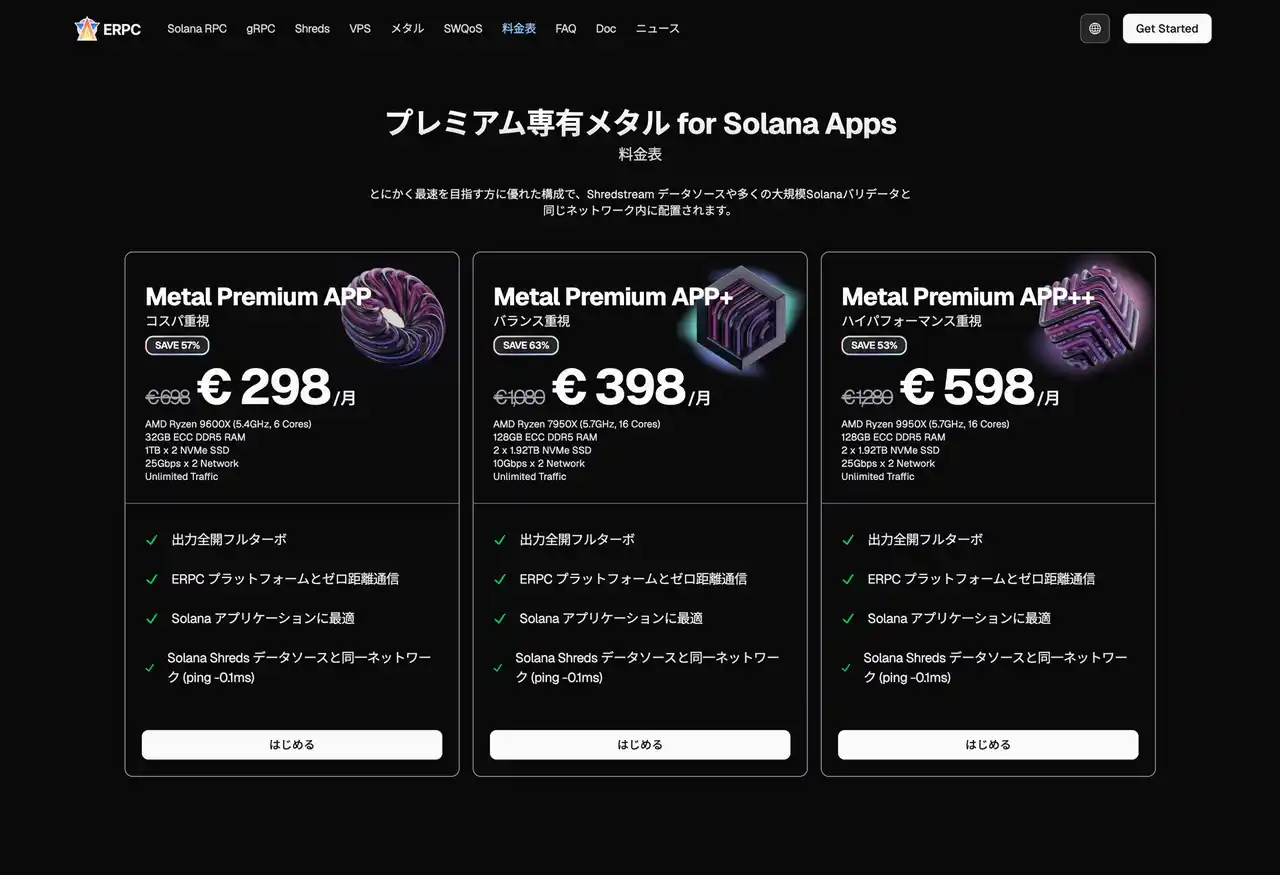 ELSOUL LABO B.V.(本社:オランダ・アムステルダム、代表取締役 CEO:川崎文武)および Validators DAO が運営する ERPC は、全リージョン(フランクフルト、アムステルダム、ロンドン、ニューヨーク、東京、シンガポール等)において提供してきた Solana アプリケーション向けプレミアムベアメタルサーバー最上位構成 Metal Premium APP++(Ryzen 9 9950X / ユーロ598/月)が完売したことをお知らせします。 |