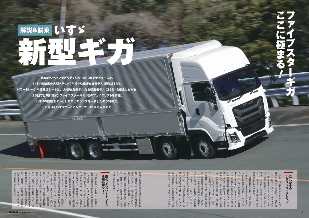 | 昨秋の「ジャパンモビリティショー2025」でデビューした「新型ギガ」はいすゞ自動車の旗艦モデル。初のフェイスリフトをはじめ力の入った改良で「25型」にチェンジした。この新型ギガの「解説&試乗」をたっぷりお届け。さらに日本市場に本格的に参入したメルセデス・ベンツ「アロクス」重量品搬送仕様の解説、5月14日から3日間開催される「ジャパントラックショー2026」の開催直前情報も必見! 今号も本誌は話題満載! | |||