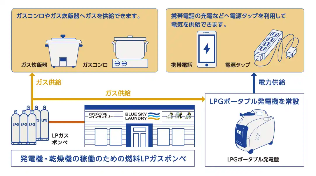 災害時には一時避難所や支援拠点としても活用可能。LPガスを3日分備蓄し、ポータブル発電機や炊き出し設備を標準装備しています。万が一の際にも、地域の皆さまの安心と安全をしっかりサポートします。 |