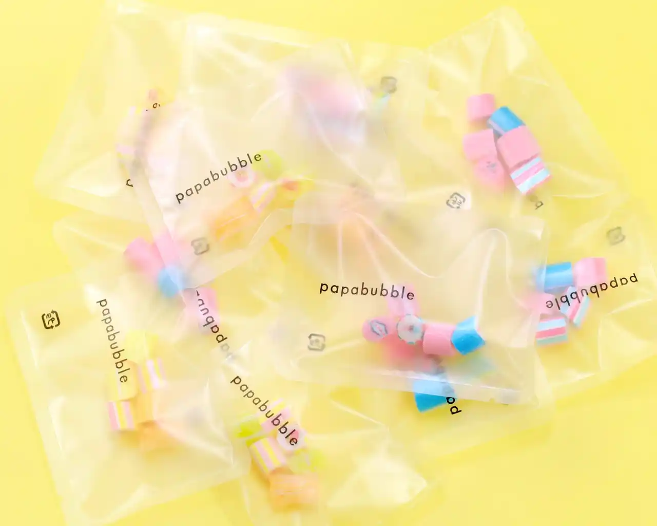 パパブブレならではの職人技を生かした枕型キャンディは、黄色いキャンディを透明なキャンディで包み、“生卵”をイメージしたデザインに仕上げています。 |