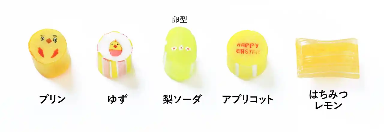 キャンディの絵柄には、思わず目を引くシュールで愛らしいヒヨコを採用。特徴的な太眉の表情で、どこかユーモラスな可愛らしさを表現しています。フレーバーも絵柄に合わせ、ヒヨコをイメージした黄色系の味わいを中心にセレクトしました。 |
