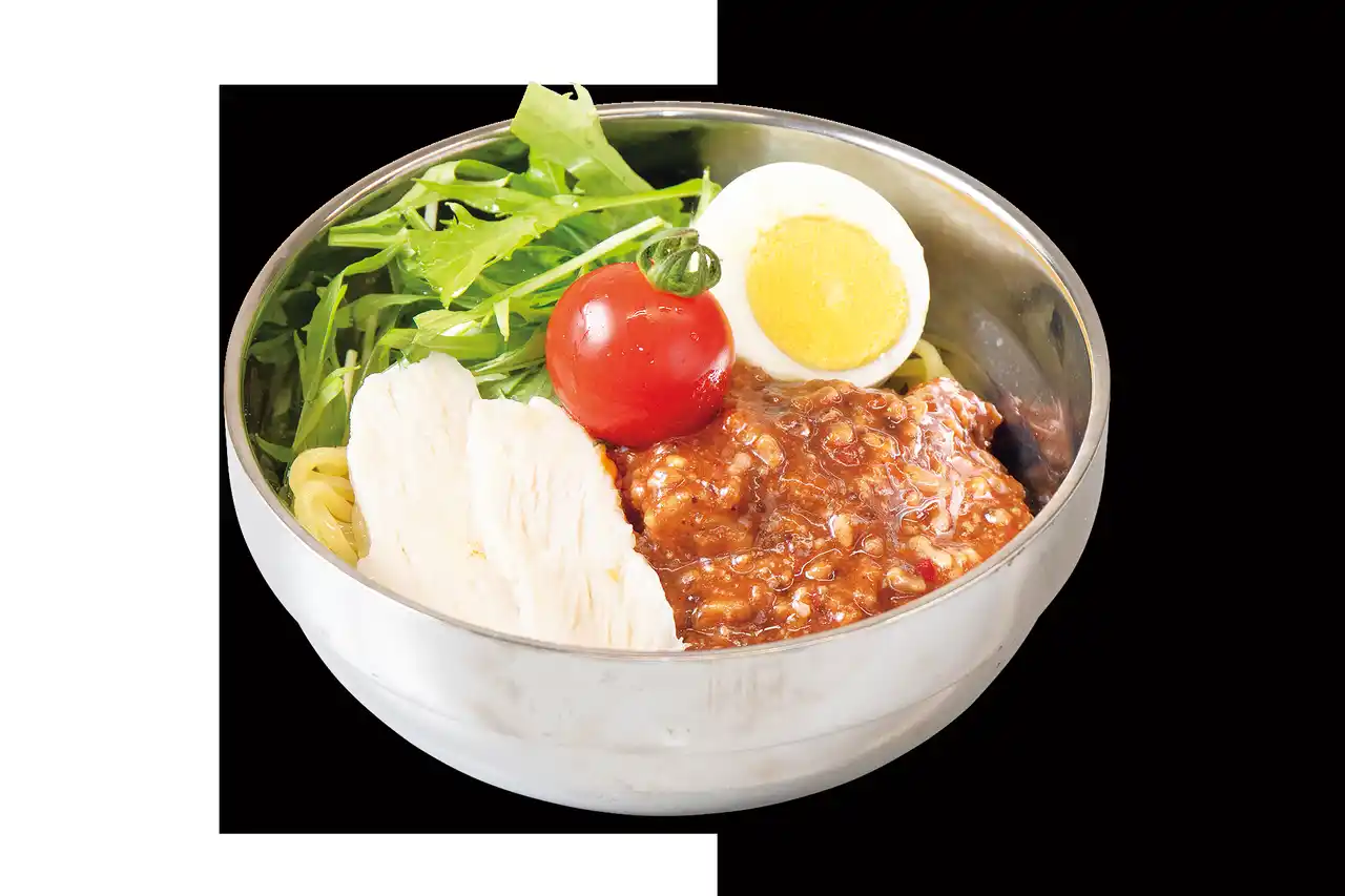 濃厚な旨辛肉味噌を麺に絡めてお召し上がりください。さっぱりとした蒸し鶏がアクセントの冷製麺です。 |