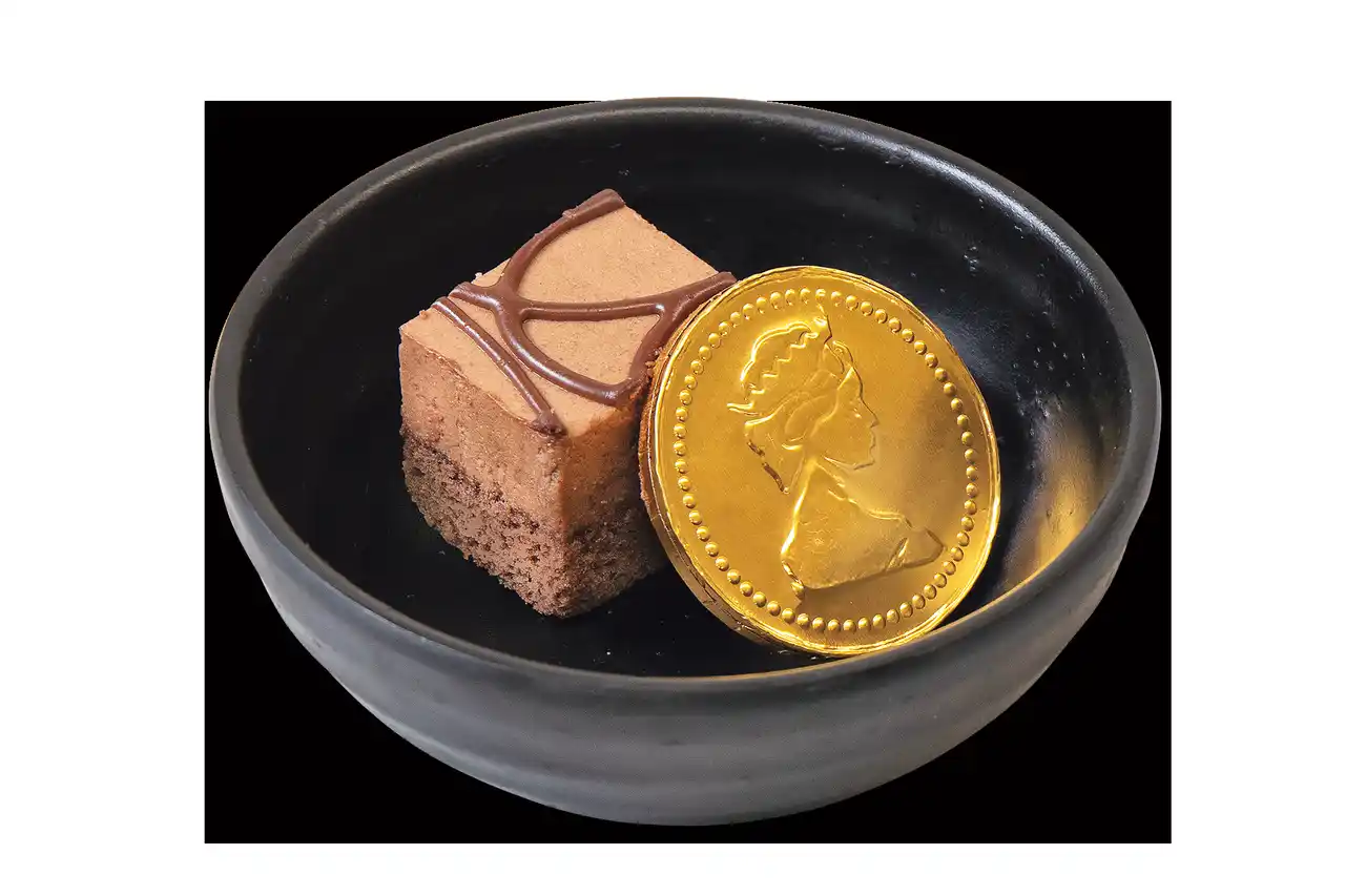 食後に嬉しいサイズのチョコケーキに、金貨チョコを添えました。 |