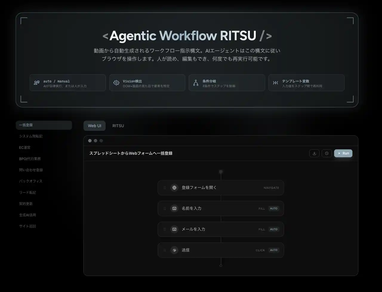 コーレは、AIエージェントに対して業務手順を正確に伝達するための汎用的なAgenticワークフロー指示構文「Agentic Workflow RITSU」を開発しました。Copelfではこの構文を中核技術として採用しており、録画から解析されたワークフローはRITSUに基づいて構造化されることで、AIエージェントが高い再現精度でブラウザ操作を実行します。 |