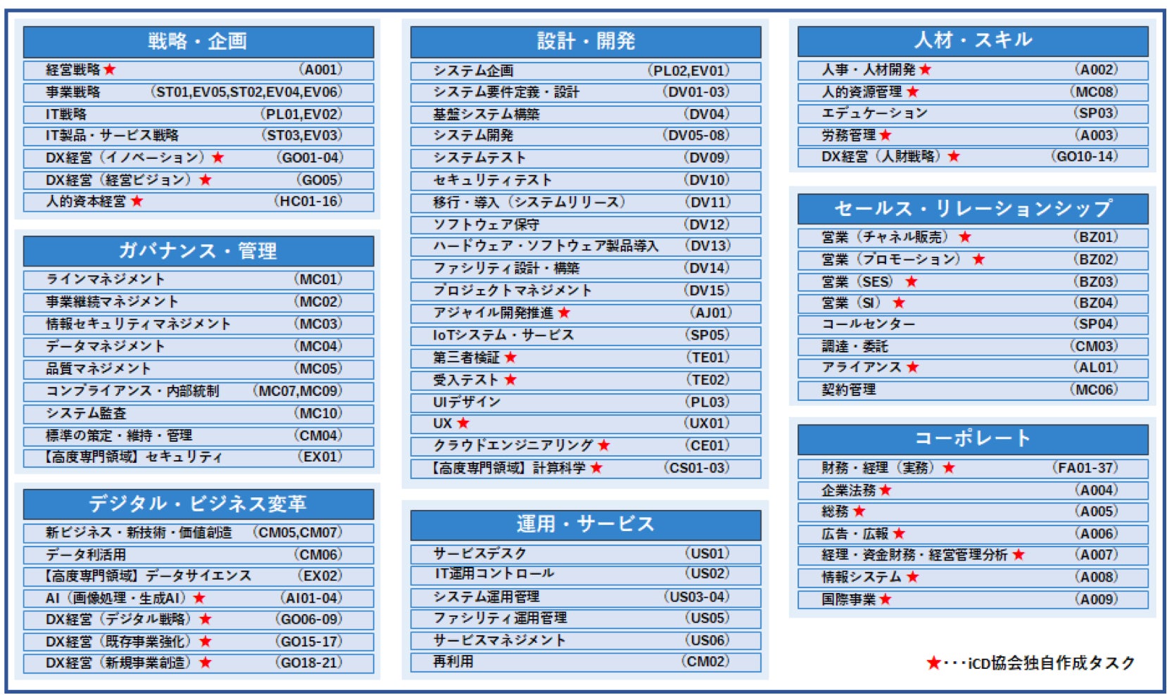 一般社団法人iCD協会(東京都千代田区、理事長:金 修)は、2018年の創立以来、時代に合わせてiCDタスクディクショナリやスキルディクショナリの刷新・拡充を行ってまいりましたが、このたび、iCDタスクディクショナリーの構成変更を行うとともに、デジタルスキル標準(うち、DX推進スキル標準)との関連性を整備、デジタルスキル標準の具体的な運用がしやすくなるよう対応を行いました。 |