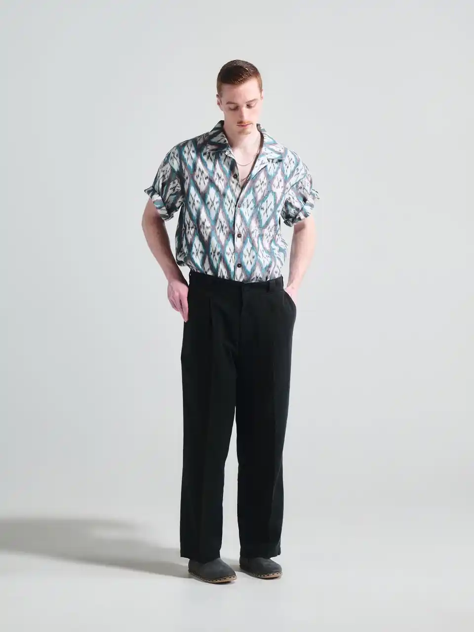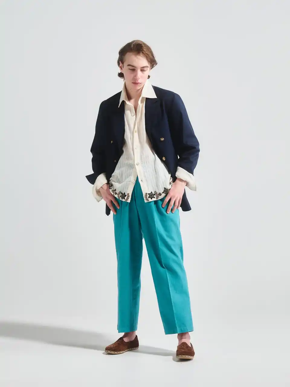 やや深い股上と緩い腰回りを基に、ワイドストレートなシルエットにアンクル丈のレングスと重たさを残しながらも抜け感が出る仕様へ。 |