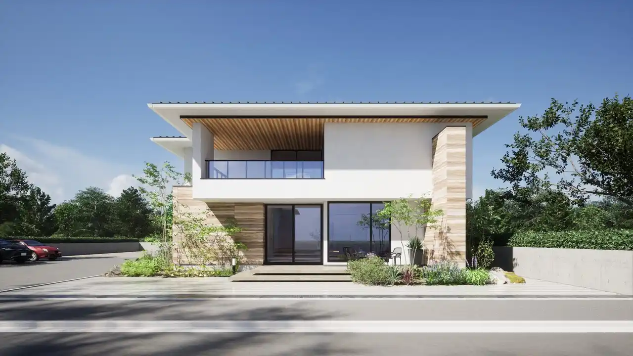 家族の毎日を豊かに彩る、開放感あふれる住まい。水平ラインを意識させる深い軒とオーバーハングで建築の力強さを演出。外観は白と黒のコントラストを基調とし、地層のような土の重なりが美しい版築柄のアクセントタイルと軒天の木目を自然素材にすることで、植栽との調和により力強さと自然の美しさを感じられます。 |