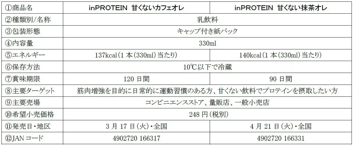 | このたび発売する「inPROTEIN 甘くないカフェオレ」「inPROTEIN 甘くない抹茶オレ」は、1本でプロテイン20gとマルチビタミンを摂取できる、甘味料不使用の甘くない高プロテイン飲料です。運動やお食事といったさまざまなシーンでお飲みいただけます。また、リキャップできて持ち運びに便利な容器のため、忙しい朝や、通勤、通学、仕事の合間、トレーニング後など、必要な時にいつでも手軽に効率よくプロテインをチャージできます。 | |||