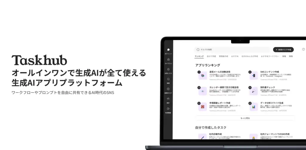 | Taskhubは、専門知識がなくても直感的な操作でAIアプリを構築できる、ノーコードAIワークフロー作成プラットフォームです。データの収集・加工からAIによる自動処理までワンストップで実現し、業務の効率化や新たなサービス創出を支援します。 | |||