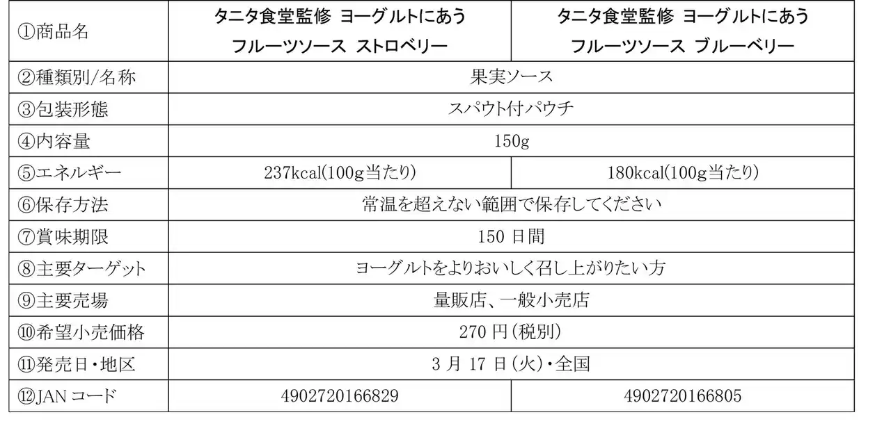 「タニタ食堂監修」シリーズは、レシピ本「体脂肪計タニタの社員食堂」(大和書房刊)がベストセラーとなった株式会社タニタと、“ヘルシーさ”と“おいしさ”を両立したコラボレーション商品を開発し、2011年3月に誕生しました。本シリーズは2026年で発売15周年を迎え、これまで“おいしさ”と“満足感”を得られる点と、カロリーや糖質に配慮した商品設計で罪悪感を抱くことなく食べられる点が、多くのお客さまから支持をいただいています。今回新発売する「タニタ食堂監修 ヨーグルトにあうフルーツソース ストロベリー」「タニタ食堂監修 ヨーグルトにあうフルーツソース ブルーベリー」は15周年記念商品となります。その他、森永乳業とタニタの共同企画としてタニタ食堂本店での期間限定イベントも実施します。 |