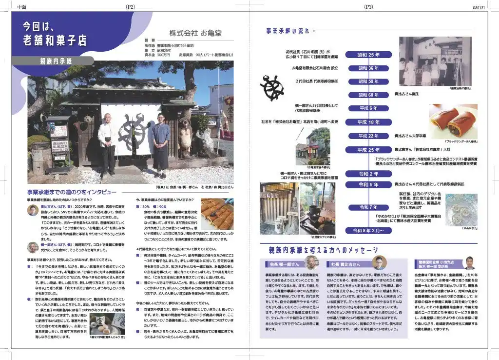 | 今回発行されたリーフレットでは、老舗和菓子店 株式会社お亀堂(本社:愛知県豊橋市/代表取締役:森貴比古)の事業承継事例が紹介されています。本リーフレットでは、創業70年以上続く和菓子店の事業承継の実体験や、4代目社長としての経営改革、今後のビジョンなどが紹介されています。 | |||||||||