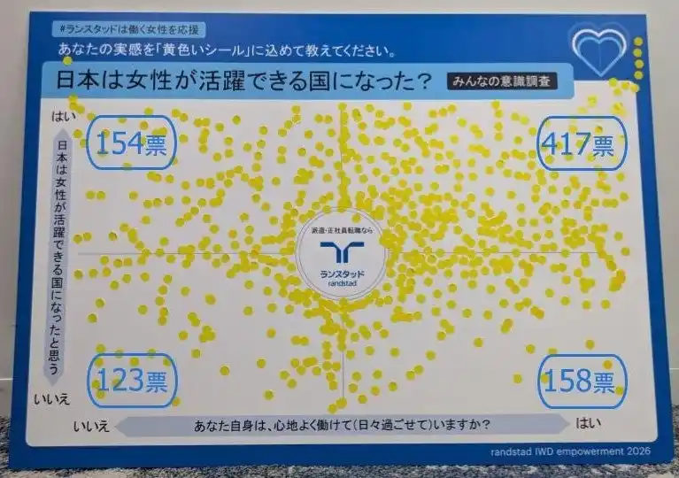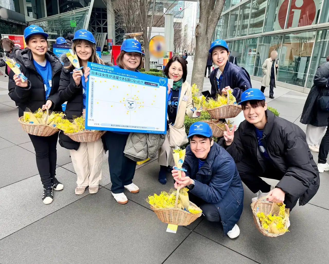 総合人材サービスを提供するランスタッド株式会社(本社:東京都千代田区 代表取締役会長兼CEO 道上 淳之介、代表取締役社長 猿谷 哲)は、3月8日の「国際女性デー」に先立ち、2026年3月6日(金)に東京国際フォーラムにて街頭啓発イベントを実施いたしました。当日は用意した1,000束のミモザブーケを配布し、働く人々への感謝を伝えると同時に、「自分らしく働く」をテーマにしたアンケート調査を行いました。一人ひとりの異なる実感が浮き彫りに。 |