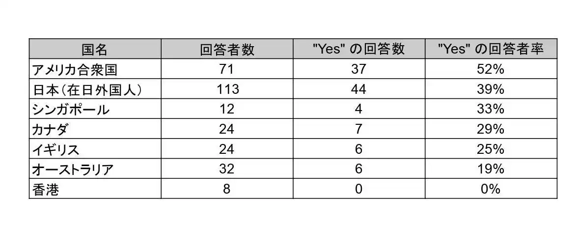 さらに注目すべき点は、日本に住む外国人(Japan)の「Yes」の割合が39%で、全体の平均(38.2%)とほぼ同じか、わずかに高い程度に留まっている点です。 |