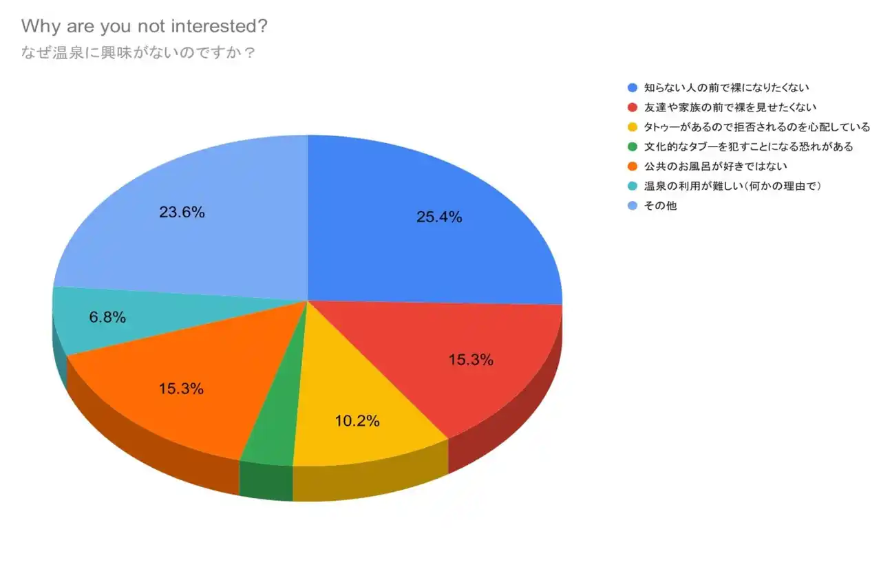 「裸」と「タトゥー」の問題に加え、「公共のお風呂が好きではない」が15.3%、「文化的なタブーを犯すことになる恐れがある」が3.4%という回答も注目すべきポイントです。 |