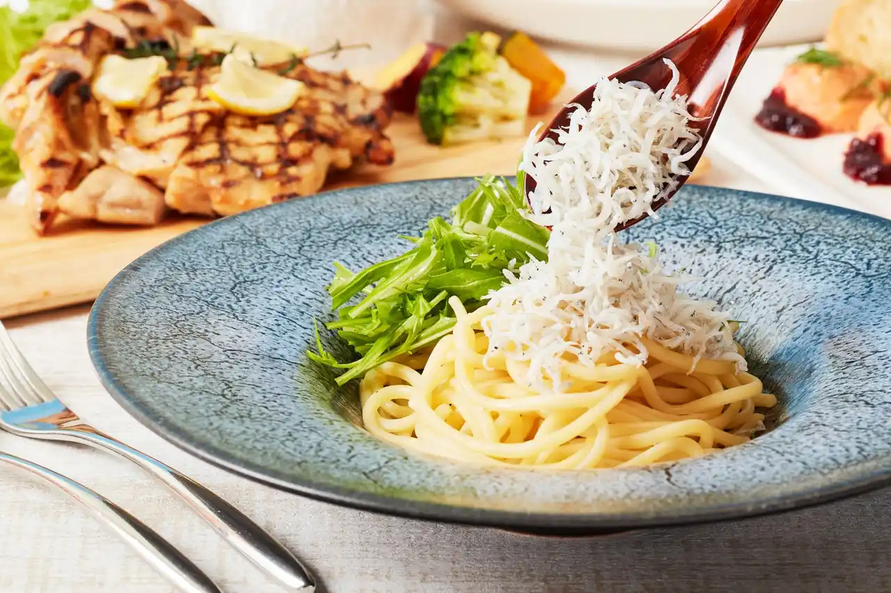 ・春のパスタ「しらすと水菜のペペロンチーノ」 【土日祝限定キッズメニュー】 ・ミニハンバーグ/鶏のから揚げ/ポテトフライ/ミニオムレツ |