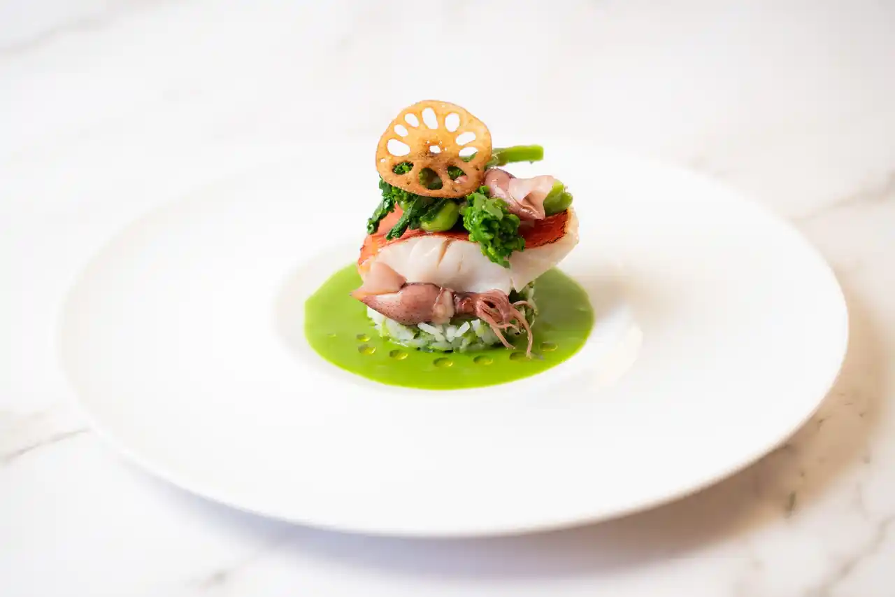 金目鯛の蒸し焼き 菜の花のクーリーと蛍烏賊のバターソース |