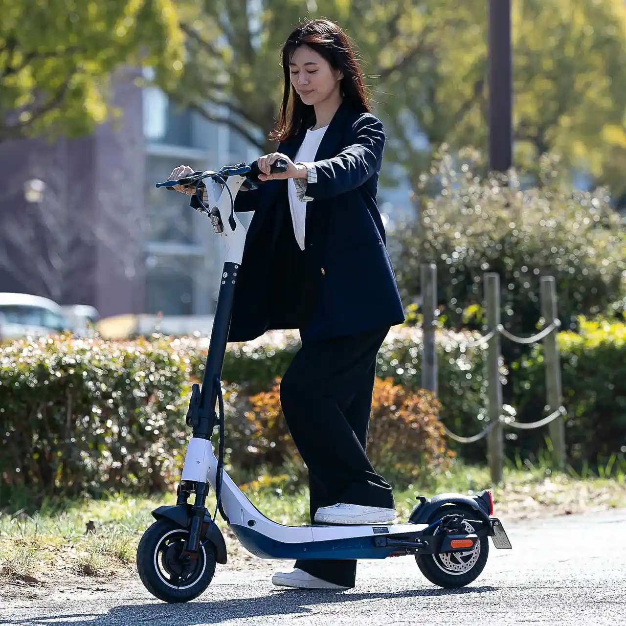 キャンペーン価格:140,800円(税込) ・カラー:エベレスト ホワイト / スレート ブラック ・モーター定格出力:600W ・モーター最大出力:1,000W ・バッテリー:リチウムイオン電池48V / 15Ah ・最大登坂能力:47% ※ ・最大航続距離:50km ※ ・走行モード:歩道走行モード 6 km/h / 車道走行モード 20km/h ・アプリ:Bluetooth アプリコントロール ・防水レベル:本体 IPX5 ・フレーム:アルミニウム合金 ・タイヤ:10インチ ノーパンクタイヤ ・ブレーキ:フロント ドラムブレーキ / リア ディスク+電動ブレーキ :サスペンション:前後搭載 ・ライト:LEDヘッドライト / リア / ブレーキ / ウィンカー / 最高速度表示灯 ・充電能力:54V 2Ah ・充電時間:7h~8h ・展開サイズ:全長1,200×全高1,200×全幅580mm ・収納サイズ:全長1,200×全高520×全幅580mm ・製品重量:23kg ・最大耐荷重:120kg ・認証:PSE、電波法技適、性能等確認試験  |