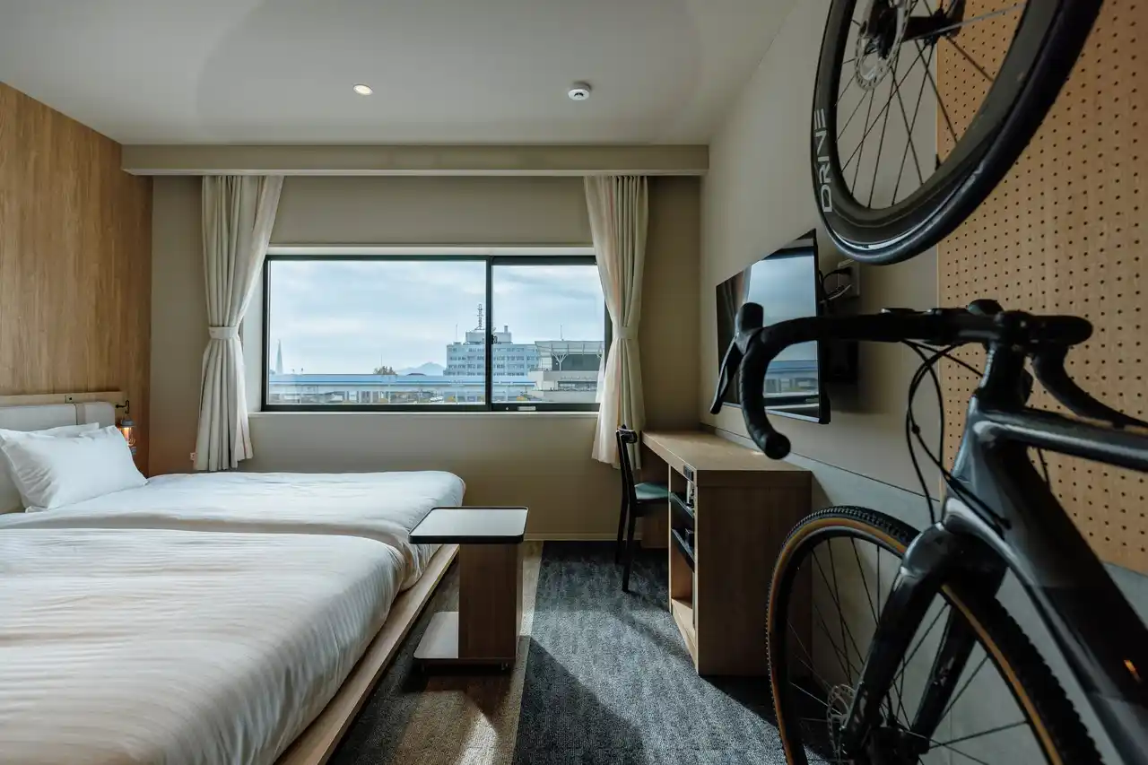 | 本ホテルは、競輪とアーバンサイクルスポーツが融合する複合施設「アーバンサイクルパークス広島」内に開業する、サイクリストフレンドリーなホテルです。プロサイクルロードレースチーム「ヴィクトワール広島」の運営によるバイクショップをはじめ、サウナ付き大浴場、カフェレストランなどを併設し、滞在・スポーツ・観戦・交流を一体で楽しめる拠点として整備されています。 | ||||||||||||||