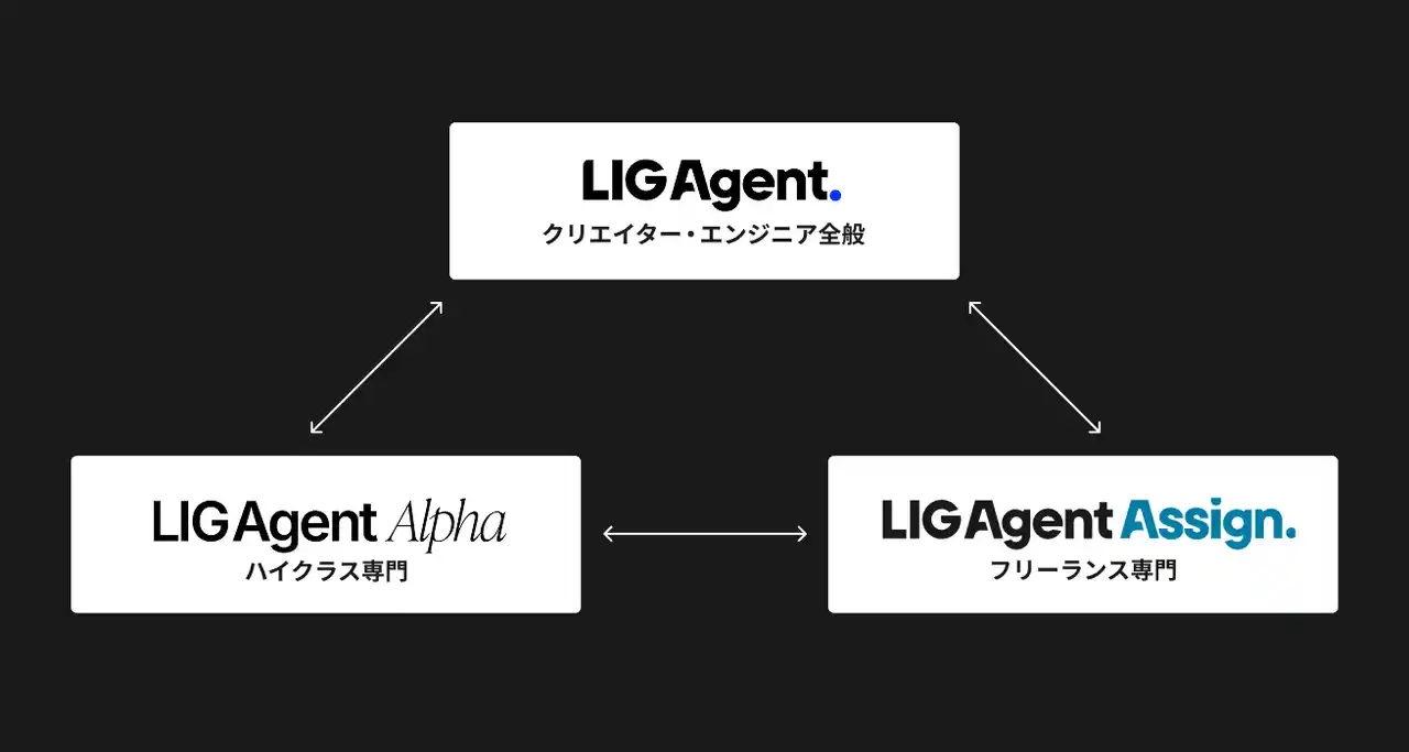 LIG Agentでは、これまで正社員転職を支援する「LIG Agent」、ハイクラス人材向けの「LIG Agent α」を展開してきました。今回の「LIG Agent Assign」はその拡張であり、フリーランスという選択肢を加えることで、一人のクリエイター・エンジニアのキャリアを、働き方をまたいで一貫して支援できる体制が整いました。 |