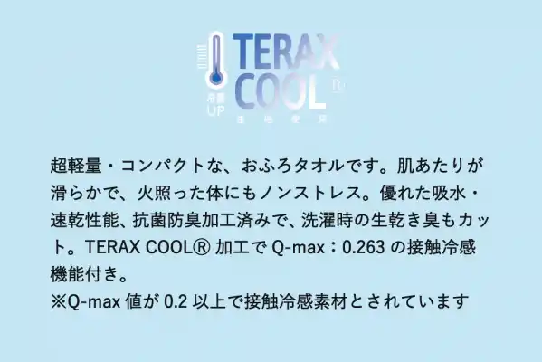 「おふろタオル-コンパクト- COOL」に採用したのは、TO&FROのファクトリーブランドとしての技術力を活かした、TERAXCOOL(R)加工つきの冷感ニット素材。TERAXCOOL(R)とは、太陽光の熱(近赤外線)を遮断し、衣服内の温度上昇を抑えるために開発された特殊加工で、Q-max値0.263という高い接触冷感性能を誇ります。これは、一般的に「触れた瞬間にひんやり」と感じる基準値0.2を大きく超える水準で、確かな涼しさを体感いただける数値です。