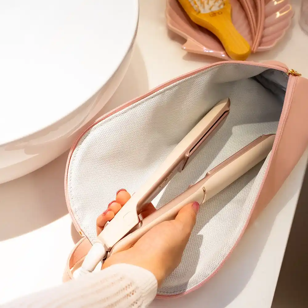 | ヘアアイロンポーチは、ホワイトとピンクミルクティーの2色展開。Lenaのヘアアイロンのイメージにあわせた大人可愛いデザインに仕上げています。ポーチ内部は耐熱仕様に加工しており、ヘアアイロン使用直後でも収納可能。これからの季節に増える、帰省や旅行、出張やちょっとしたお出かけ先へ持ち運ぶ時に便利です。また、自宅での保管時にはポーチ上部のループをフックにかけるなどすることで、洗面所にも吊り下げて収納できます。 | |||