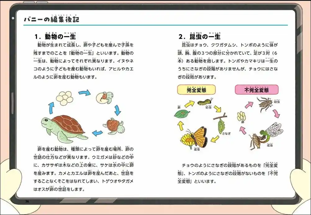 | さらに毎話の最後には、「バニーの編集後記」としてその章のメインとなるテーマの知識をまとめて紹介。1巻では動物の誕生・生物の特徴と分類・環境について、2巻では磁石の性質・光の性質・電流の働きについて学ぶことができ、日本の小学校中学年の理科で習う単元のサポートとしても活用できます。 | |||