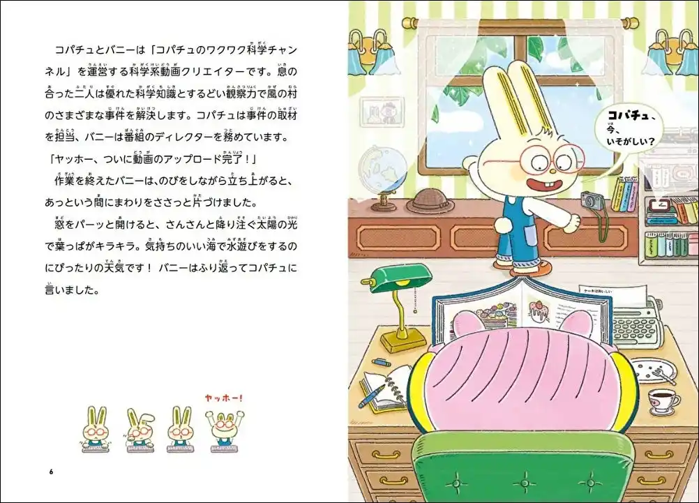 | 物語の主人公は、町で起こる様々な事件を科学の力で「ブヒン!ブヒン!」と解決する科学クリエイター、ブタのコパチュと、感情豊かでセンス抜群のディレクター、ウサギのバニーです。二人は「コパチュのワクワク科学チャンネル」という動画チャンネルを運営しており、ワクワクゆかいな動画を視聴者に届けています。 | |||