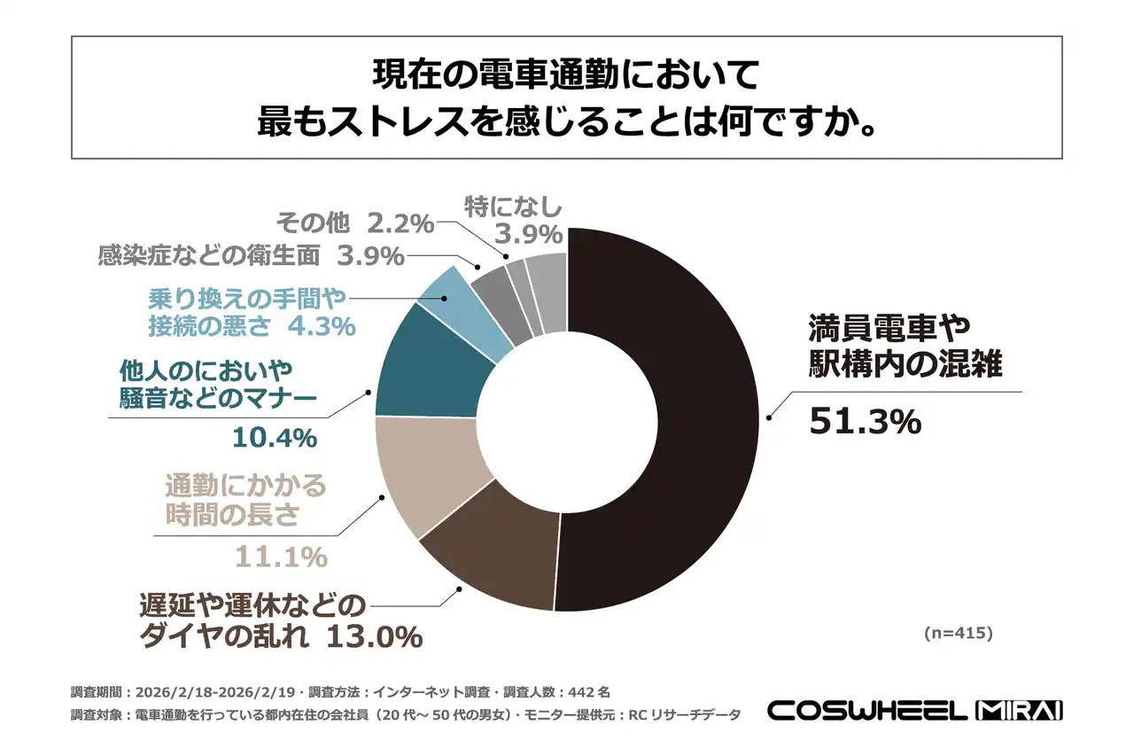 次に、現在の電車通勤に何らかのストレスを感じている都内在住の会社員を対象に「現在の電車通勤において最もストレスを感じることは何か」を尋ねる設問への回答では、1位が「満員電車や駅構内の混雑」で51.3%、2位が「遅延や運休などのダイヤの乱れ」で13.0%、3位が「通勤にかかる時間の長さ」で11.1%という結果になりました。この結果から、電車通勤に何らかのストレスを感じている都内在住の会社員が、現在の電車通勤において最もストレスを感じることは、「満員電車や駅構内の混雑」であることが明らかになりました。 |