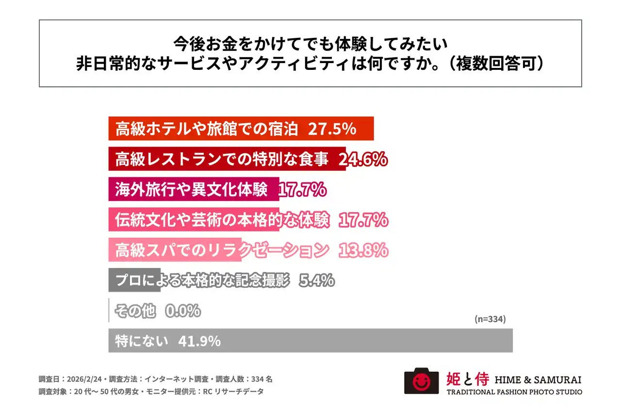 調査の最後、「今後お金をかけてでも体験してみたい非日常的なサービスやアクティビティは何か」を尋ねる設問への回答では、1位が「特にない」で41.9%、2位が「高級ホテルや旅館での宿泊」で27.5%、3位が「高級レストランでの特別な食事」で24.6%という結果になりました。「特にない」という回答が最多である一方、20代~50代の男女が今後お金をかけてでも体験してみたい非日常的なサービスやアクティビティとして主に挙げられたのは、「高級ホテルや旅館での宿泊」や「高級レストランでの特別な食事」であることが明らかになりました。 |