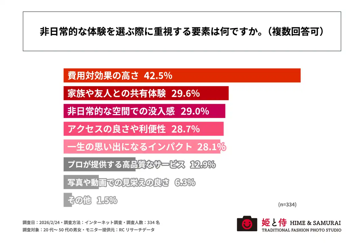 ・非日常的な体験を選ぶ際に重視する要素トップ3は、1位「費用対効果の高さ」、2位「家族や友人との共有体験」、3位「非日常的な空間での没入感」 |