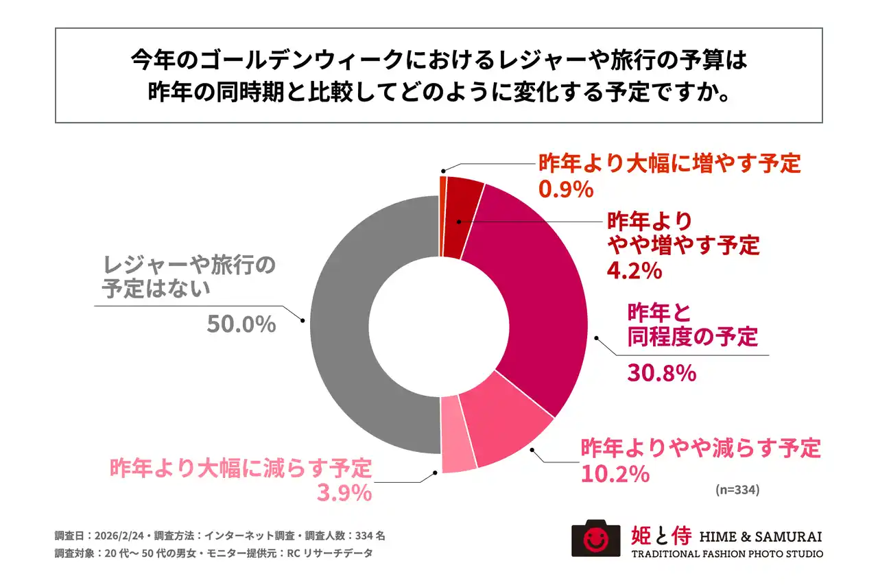 20代~50代の男女の半数が今年のゴールデンウィークにレジャーや旅行の予定がない一方、予定がある人の予算は「昨年と同程度」が最多 |