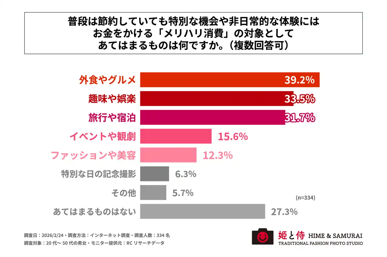 また、「普段は節約していても特別な機会や非日常的な体験にはお金をかける『メリハリ消費』の対象は何か」を尋ねる設問への回答では、1位が「外食やグルメ」で39.2%、2位が「趣味や娯楽」で33.5%、3位が「旅行や宿泊」で31.7%という結果になりました。この結果から、普段は節約していても特別な機会や非日常的な体験にはお金をかける「メリハリ消費」の主な対象は、「外食やグルメ」や「趣味や娯楽」であることが判明しました。 |