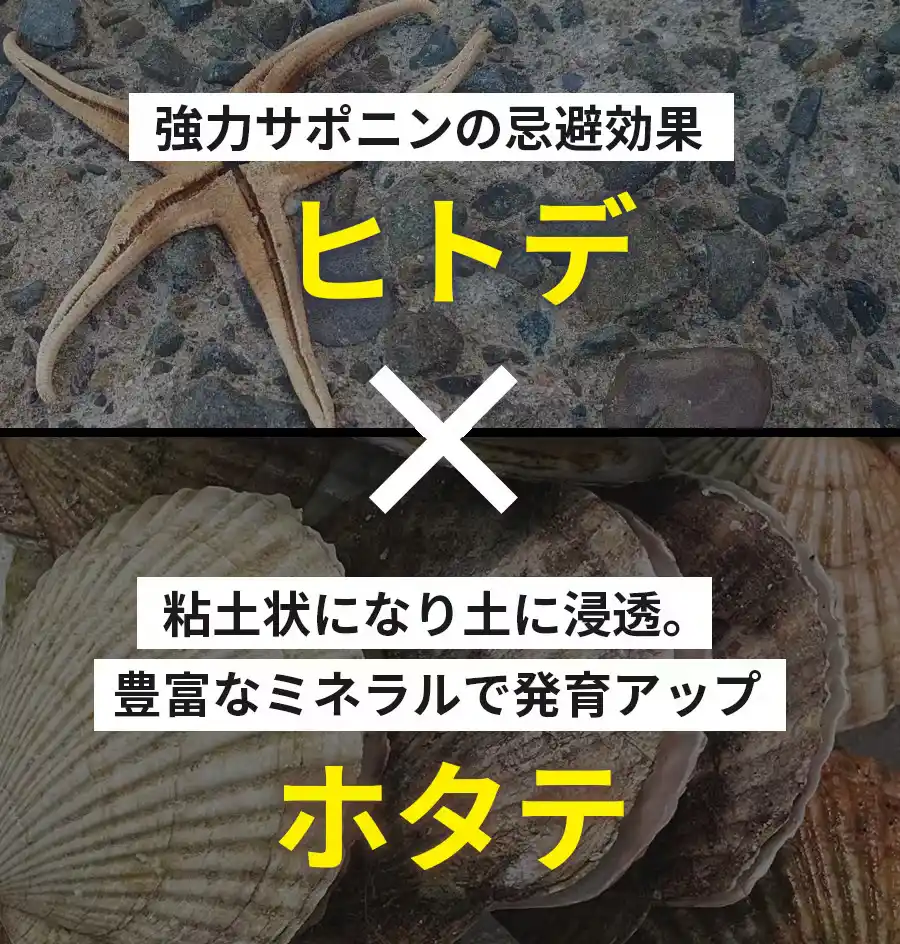 ヒトデに含まれるサポニン成分とホタテの殻(うろ)を特殊配合。ホタテの殻が水分を含むと粘土状になり土壌に浸透する特性により、従来の忌避剤では困難だった長期持続を実現。 |
