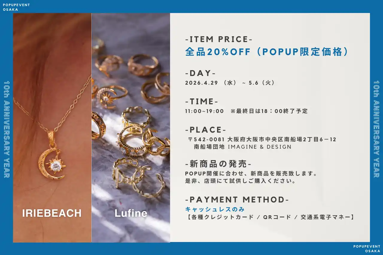 第一弾として、「IRIEBEACH(アイリービーチ)」と姉妹ブランド「Lufine(ルフィーネ)」による合同POPUPイベントを、大阪・南船場にて8日間限定で開催いたします。