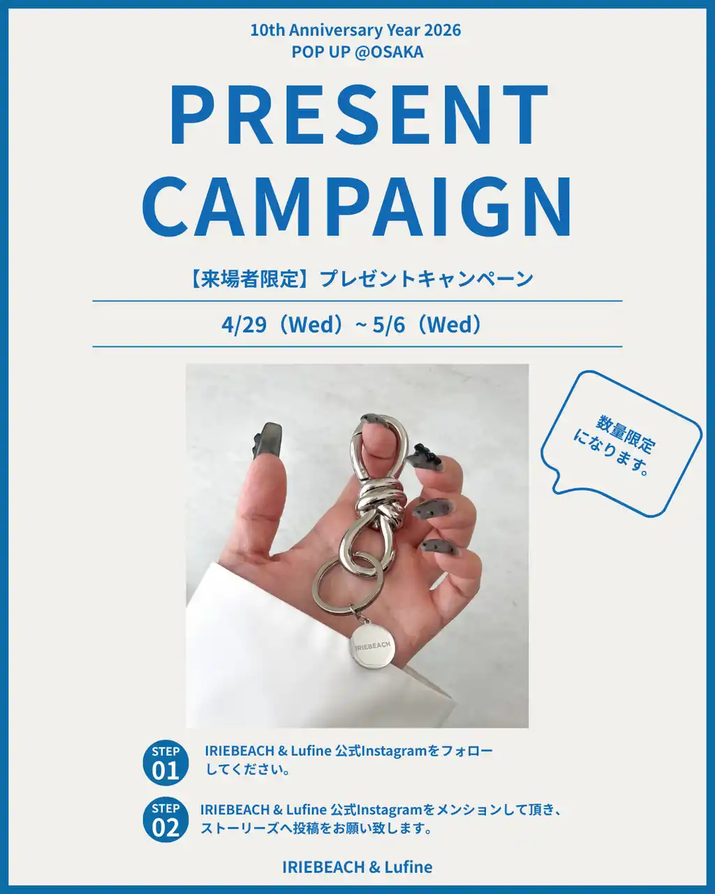 | 第一弾として、「IRIEBEACH(アイリービーチ)」と姉妹ブランド「Lufine(ルフィーネ)」による合同POPUPイベントを、大阪・南船場にて8日間限定で開催いたします。 | |||||||||||||||||